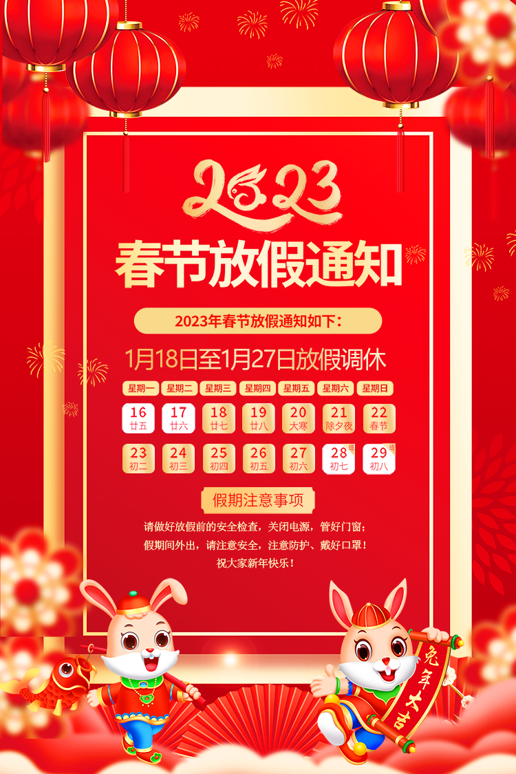 根據(jù)《國務院辦公廳關于2023年部分節(jié)假日安排的通知》,結合我公司的實際情況,現(xiàn)將我公司2023年春節(jié)放假具體安排如下: